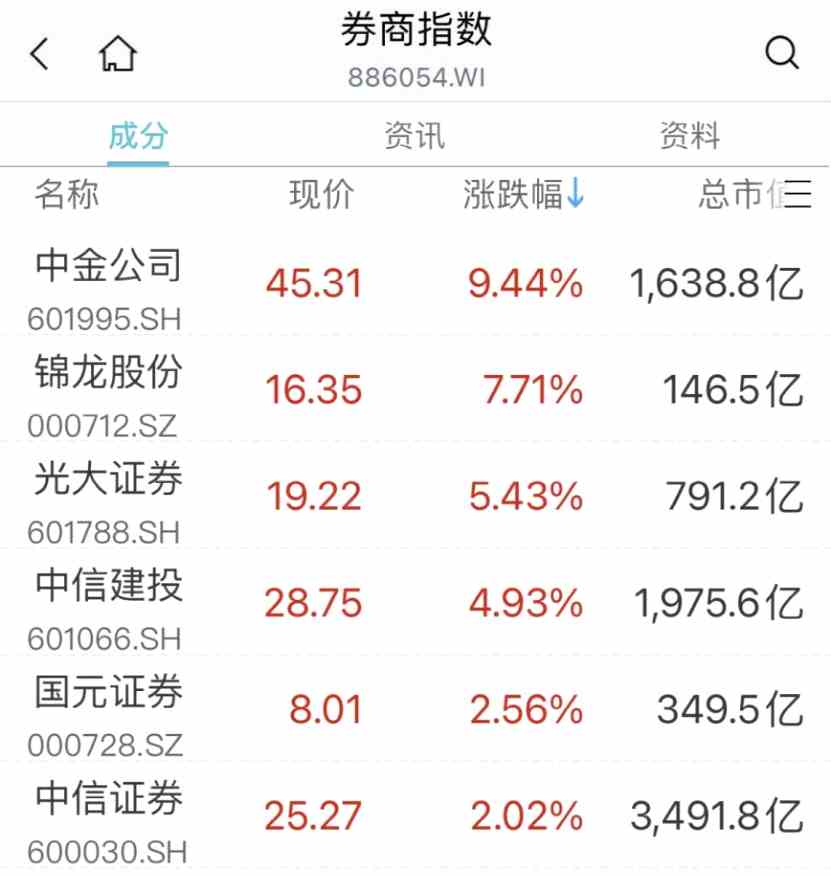 隨后券商股盤中上演局部“大反攻”,中金公司由跌轉(zhuǎn)漲,一度觸及漲停,錦龍股份(000712)、光大證券、中信建投(601066)漲超4%,國元證券、中國銀河(601881)等跟漲。