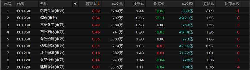 漲停股方面,今日有38只個(gè)股以漲停價(jià)報(bào)收,其中,有7只個(gè)股股價(jià)已連續(xù)上漲超過3個(gè)交易日;7只個(gè)股跌停報(bào)收。從申萬一級(jí)行業(yè)看,醫(yī)藥生物行業(yè)漲停股數(shù)量居首,達(dá)11只,機(jī)械設(shè)備和建筑裝飾的漲停股數(shù)均為4只。