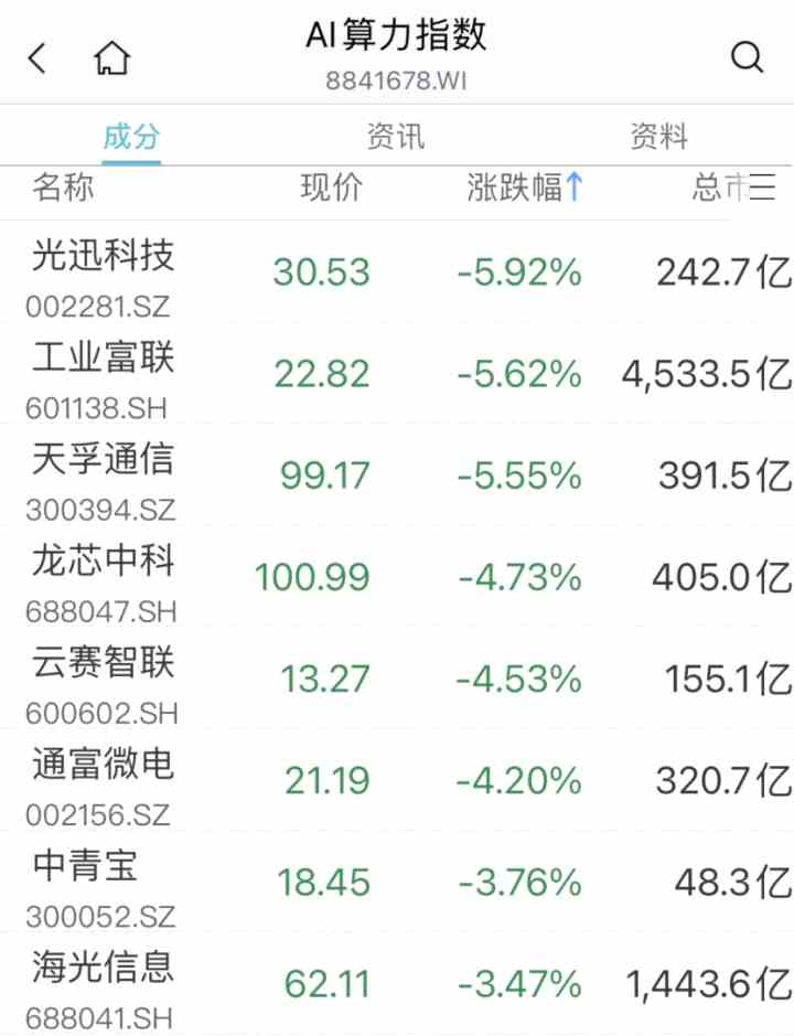 算力概念震蕩下挫,工業(yè)富聯(lián)(601138)大跌近6%,光迅科技(002281)、天孚通信(300394)、龍芯中科等跌幅靠前。