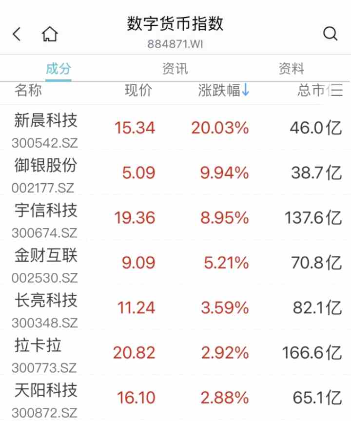 數(shù)字貨幣、信創(chuàng)概念表現(xiàn)活躍,新晨科技(300542)20CM漲停,恒銀科技(603106)斬獲四連板,宇信科技(300674)、金財(cái)互聯(lián)(002530)、長(zhǎng)亮科技(300348)等跟漲。