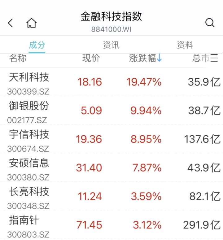 金融科技股同樣走高,天利科技(300399)20CM漲停,御銀股份(002177)、安碩信息(300380)、指南針(300803)等漲幅居前。