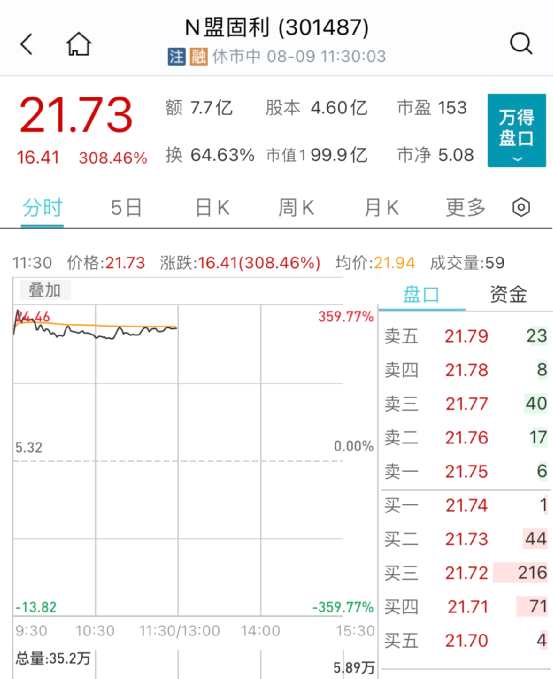年內(nèi)最強(qiáng)新股!8月9日,盟固利今日創(chuàng)業(yè)板上市,盤中大漲逾350%,創(chuàng)年內(nèi)上市新股最大漲幅。該股發(fā)行價(jià)格5.32元/股,當(dāng)前股價(jià)報(bào)21.73元/股。
