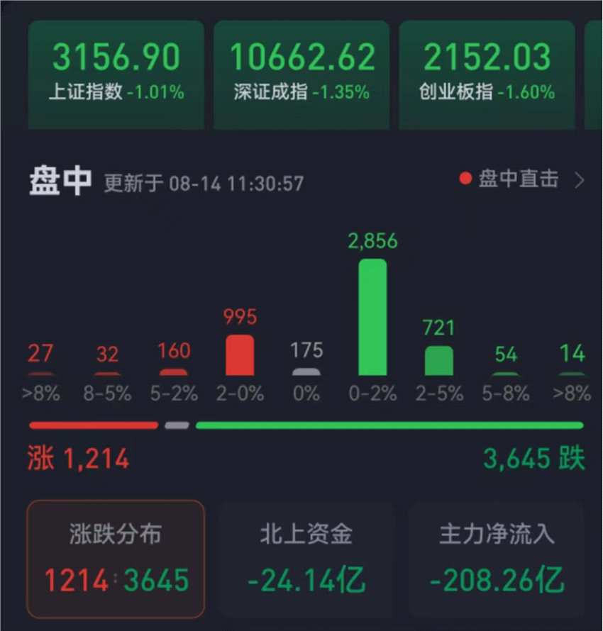 周一(8月14日),三大股指繼續(xù)震蕩回落,跌幅均超1%。截至上午收盤,上證指數(shù)跌幅達(dá)1.01%,報(bào)3156.90點(diǎn);深證成指和創(chuàng)業(yè)板指跌幅分別為1.35%和1.60%;滬深兩市合計(jì)成交額4603.5億元,總體來看,兩市個(gè)股跌多漲少,超3600只個(gè)股下跌。