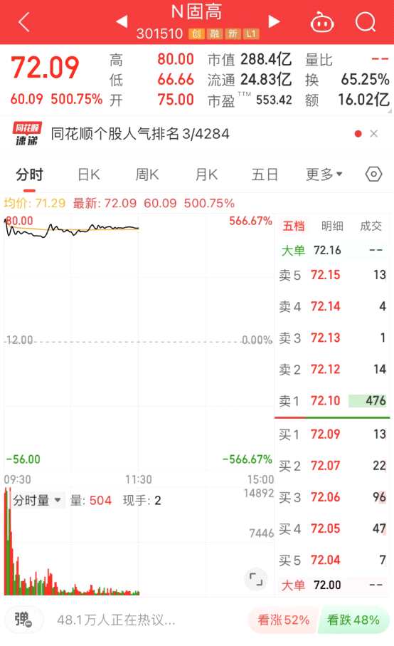 繼上周的盟固利、藍(lán)箭電子等之后,今天上午,A股又有一只新股暴漲,N固高(301510)上漲500.75%。