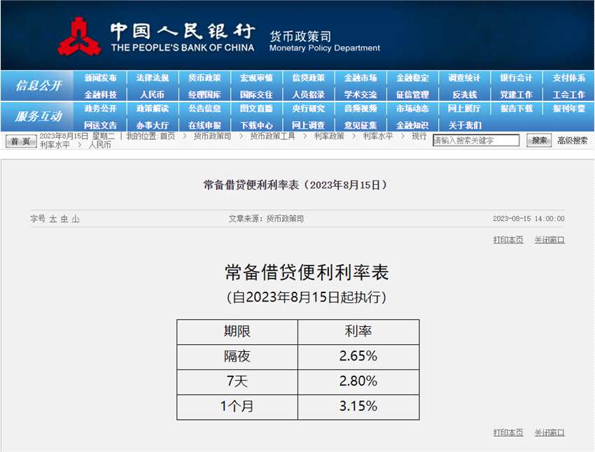 中國(guó)人民銀行8月15日調(diào)整常備借貸便利利率,隔夜期下調(diào)10個(gè)基點(diǎn)至2.65%,7天期下調(diào)10個(gè)基點(diǎn)至2.80%,1個(gè)月期下調(diào)10個(gè)基點(diǎn)至3.15%。