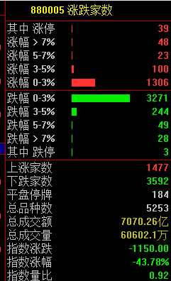 今日成交7070億元。截至收盤滬指跌0.07%,深成指跌0.7%,創(chuàng)業(yè)板指跌0.74%。共1477只個(gè)股上漲,3592只個(gè)股下跌,北向資金凈賣出近98億元。
