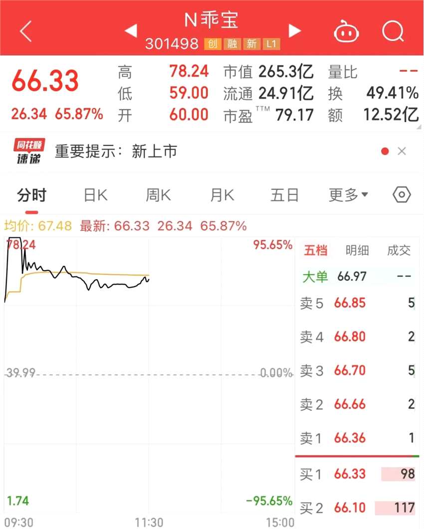 8月16日,A股市場(chǎng)3只新股上市集體高開,北交所新股N路橋盤中一度上漲224.43%,收盤漲121.57%。創(chuàng)業(yè)板新股N乖寶(301498)開盤五分鐘內(nèi)觸及臨停,盤中最高漲95.05%,收盤漲65.87%??苿?chuàng)板新股N司南盤中最高漲78.81%,收盤漲48.61%。