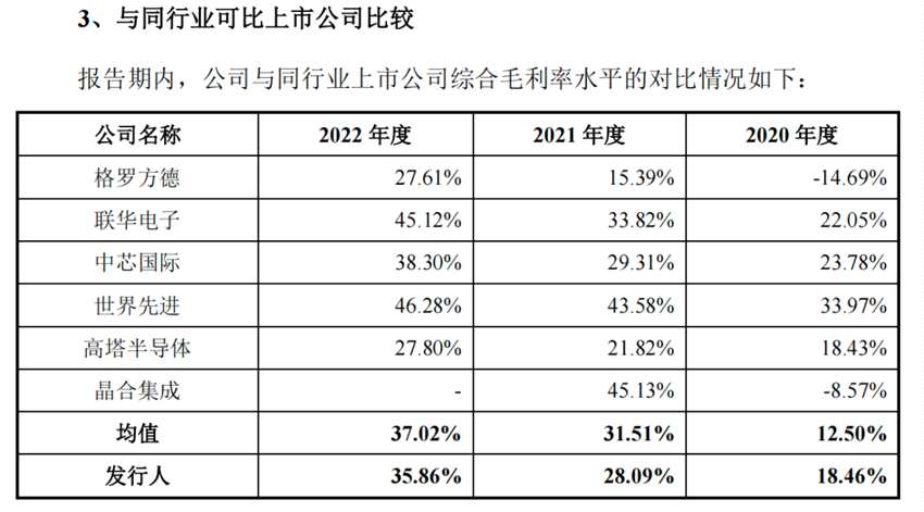 2020-2022年,公司的綜合毛利分別為12.44億元、29.86億元和60.20億元,綜合毛利率分別為18.46%、28.09%和35.86%。但與同行業(yè)可比公司相比,華虹2021及2022年的綜合毛利率水平均低于行業(yè)平均水平。