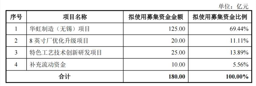 據華虹2023年7月31日披露的招股說明書,公司擬募集資金180.00億元,其中125億元用于華虹制造(無錫)項目,25億元用于特色工藝技術創(chuàng)新研發(fā)項目,20億元用于8英寸廠優(yōu)化升級項目,10億元用于補充流動資金。