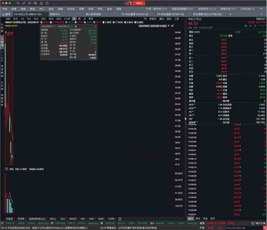 2023年8月7日,華虹半導體有限公司(簡稱“華虹公司”,股票代碼“688347”)登陸上交所科創(chuàng)板,成功實現“A+H”上市。華虹每股發(fā)行價為52元,開盤報59.88元,最高至59.88元,截至收盤報53.06元,漲幅2.04%,成交額34.36億元。