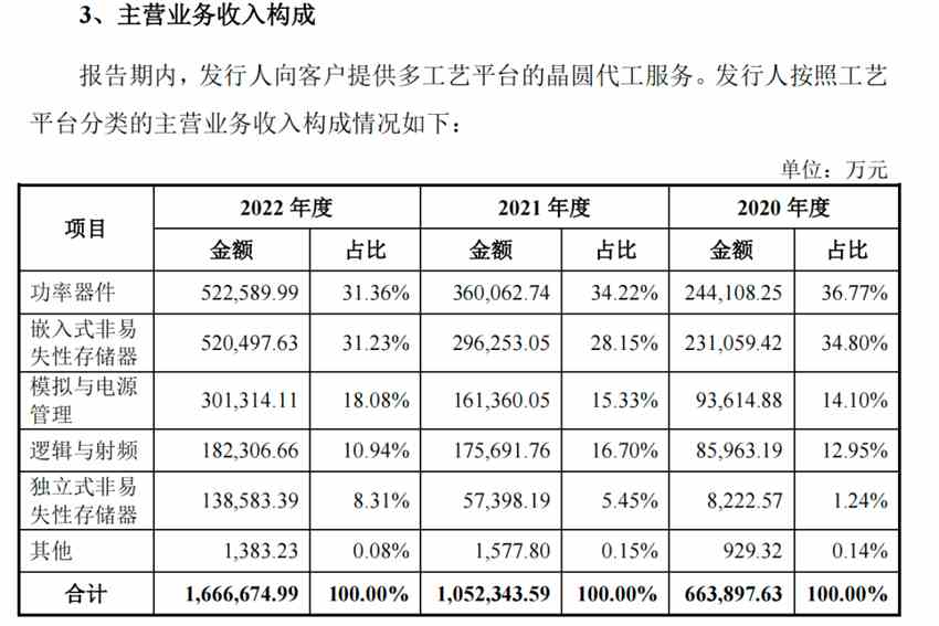 資料顯示,2020-2022年,華虹總營收分別為67.37億元、106.3億元和167.86億元。其中,晶圓代工是主營業(yè)務收入,報告期內各期收入分別為64.00億元、100.79億元和159.98億元,占總營收的比例分別為96.40%、95.78%和95.99%。