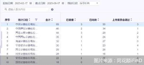 同花順(300033)iFinD數(shù)據(jù)顯示,2023年全面注冊(cè)制落地以來,截至8月16日,共有64家券商合計(jì)保薦596個(gè)IPO項(xiàng)目,目前389家申報(bào)企業(yè)獲問詢,29家申報(bào)企業(yè)注冊(cè)生效。同期,終止審核數(shù)量則為15家。而2022年同期,上市委審核數(shù)據(jù)顯示57家券商合計(jì)保薦402個(gè)項(xiàng)目,其中60家企業(yè)注冊(cè)生效。