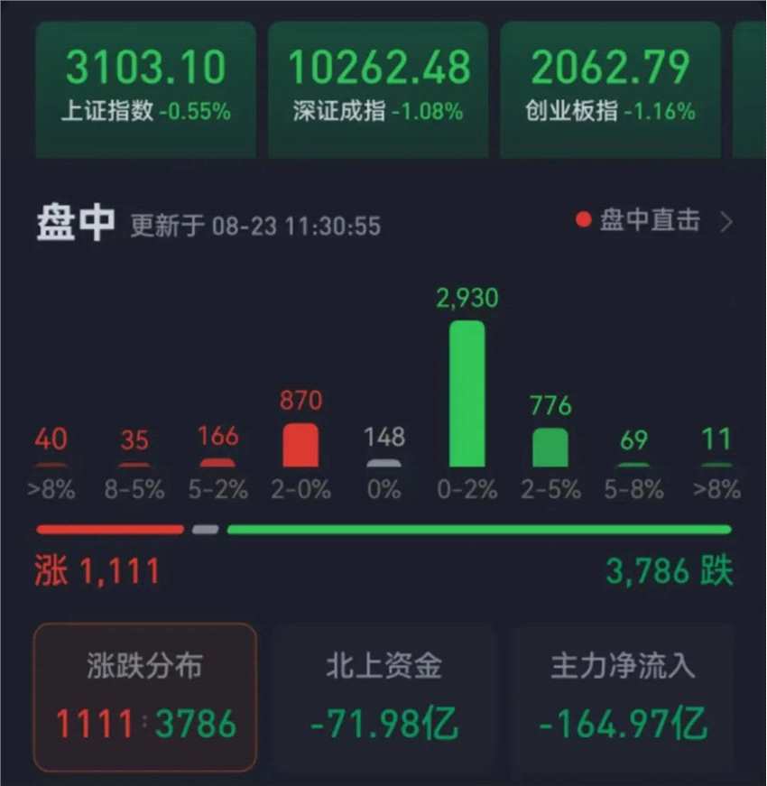 周三(8月23日),三大股指繼續(xù)震蕩整理。截至上午收盤(pán),上證指數(shù)跌0.55%,報(bào)3103.1點(diǎn);深證成指和創(chuàng)業(yè)板指分別跌1.08%和1.16%;滬深兩市合計(jì)成交額4204.6億元,總體來(lái)看,兩市個(gè)股跌多漲少,其中,漲停個(gè)股達(dá)29只,跌停個(gè)股5只。
