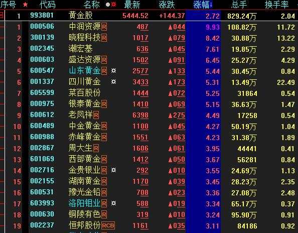 具體看,截至8月24日上午收盤,黃金股板塊漲幅居首,達(dá)2.72%。其中,中潤資源(000506)、曉程科技(300139)等概念股漲幅均超8%。