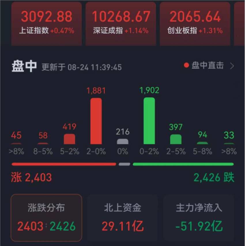 周四(8月24日),三大股指繼續(xù)震蕩。截至上午收盤,上證指數(shù)漲0.47%,報(bào)3092.88點(diǎn);深證成指和創(chuàng)業(yè)板指漲幅分別為1.14%和1.31%;滬深兩市合計(jì)成交額4697.0億元,總體來看,兩市個(gè)股漲跌相近,上漲和下跌個(gè)股均超2400只。