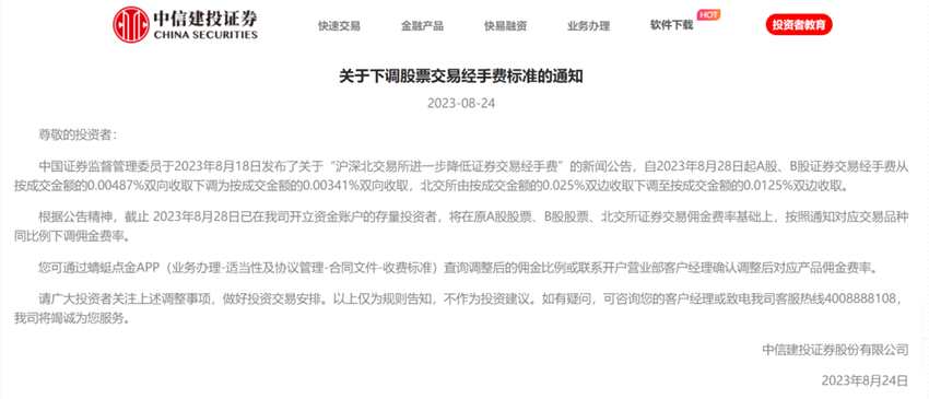 《告知函》表示,自2023年8月28日起,公司將對(duì)存量投資者交易傭金(含規(guī)費(fèi),下同)統(tǒng)一進(jìn)行下調(diào),其中滬深交易所,涉及A股、B股、存托憑證品種的交易傭金,將在投資者原有傭金基礎(chǔ)上統(tǒng)一下調(diào)0.00146%;滬深A(yù)股、滬市B股大宗交易傭金將在投資者原有傭金基礎(chǔ)上統(tǒng)一下調(diào)0.001022%,深圳B股大宗交易將在投資者原有傭金基礎(chǔ)上統(tǒng)一下調(diào)0.00073%;北交所普通股、優(yōu)先股交易傭金將在投資者原有傭金基礎(chǔ)上統(tǒng)一下調(diào)0.0125%。