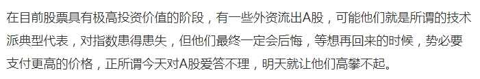 另外再近期外資持續(xù)“減倉”的背景下,該文還旗幟鮮明的指出,在目前股票具有極高投資價值的階段,有一些外資流出A股,他們最終一定會后悔,等想再回來的時候,勢必要支付更高的價格,正所謂今天對A股愛答不理,明天就讓他們高攀不起。
