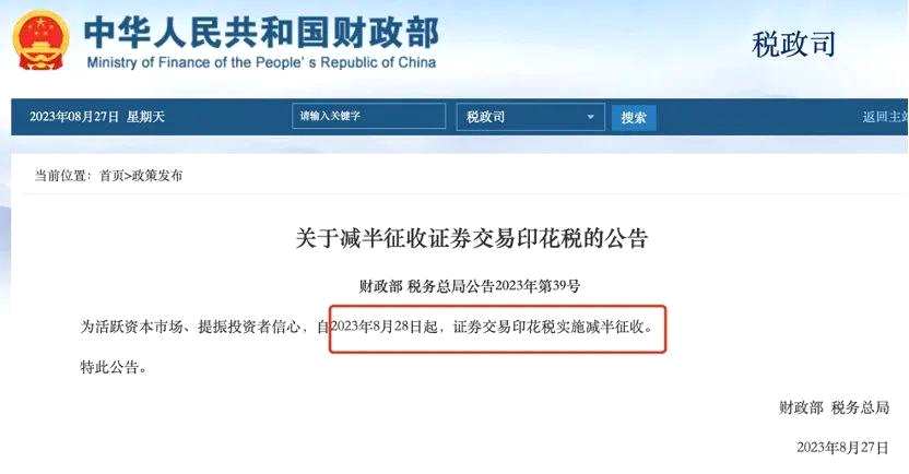 8月27日,證監(jiān)會等部門連發(fā)四條政策,提振投資者信心。市場普遍期待的多項重磅政策將在近期生效。這些政策分別是:一、自2023年8月28日本周一起,證券交易印花稅實施減半征收,這是十五年來首次下調印花稅;
