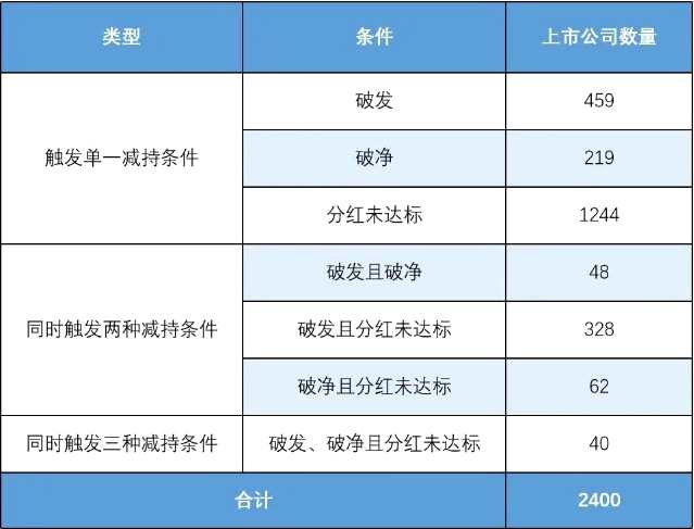 因此,根據(jù)上述條件,小編初步對5265家A股上市公司進(jìn)行了篩選,受到上述減持條件影響的上市公司去重后共有2400家,占全部A股公司的比例為45.58%。具體情況詳見下表:
