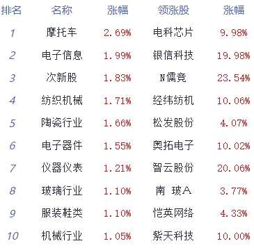 板塊方面,半導體及元件、電子化學品、電子化學品、計算機應用、光學光電子等漲幅居前,證券、養(yǎng)殖業(yè)、公路鐵路運輸、環(huán)保、銀行等跌幅居前。