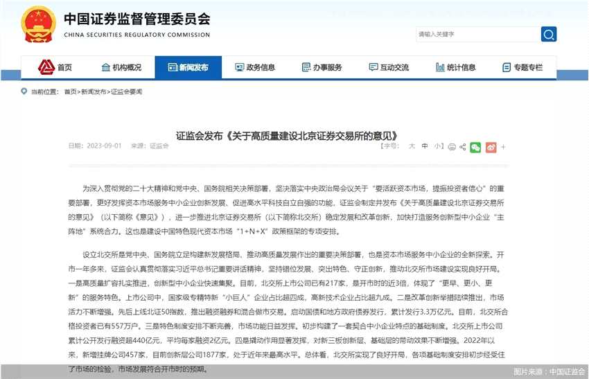 摘要: 9月1日,中國證監(jiān)會發(fā)布關(guān)于高質(zhì)量建設(shè)北京證券交易所的意見。其中在穩(wěn)步推進市場改革創(chuàng)新方面,提到要持續(xù)豐富產(chǎn)品體系。高標(biāo)準(zhǔn)建設(shè)北交所政府債券市場,支持北交所推進信用債市場建設(shè)。