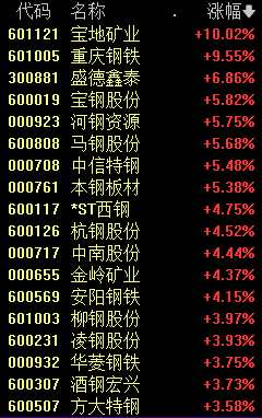 資源股中,煤炭、鋼鐵、有色金屬、水泥等板塊暴漲。