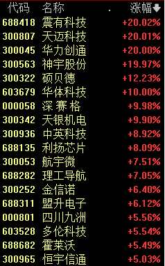 今天上午,華為概念股再度爆發(fā)。廣信材料(300537)、天邁科技(300807)等多股漲停。捷榮技術(shù)(002855)漲停,迎來六連板。華力創(chuàng)通(300045)漲停,近4個(gè)交易日累計(jì)漲超75%。