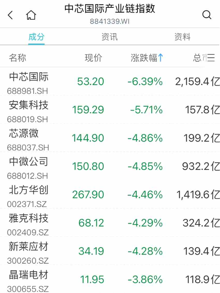 中芯國際產(chǎn)業(yè)鏈指數(shù)全線走低,北方華創(chuàng)(002371)跌超4%。