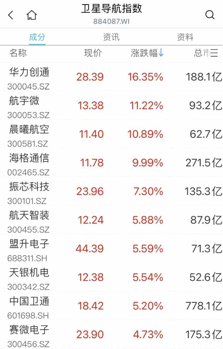 衛(wèi)星通信概念股震蕩走高,華力創(chuàng)通大漲16%,海格通信(002465)直線拉漲停,振芯科技(300101)、晨曦航空(300581)、航宇微(300053)等漲幅居前。