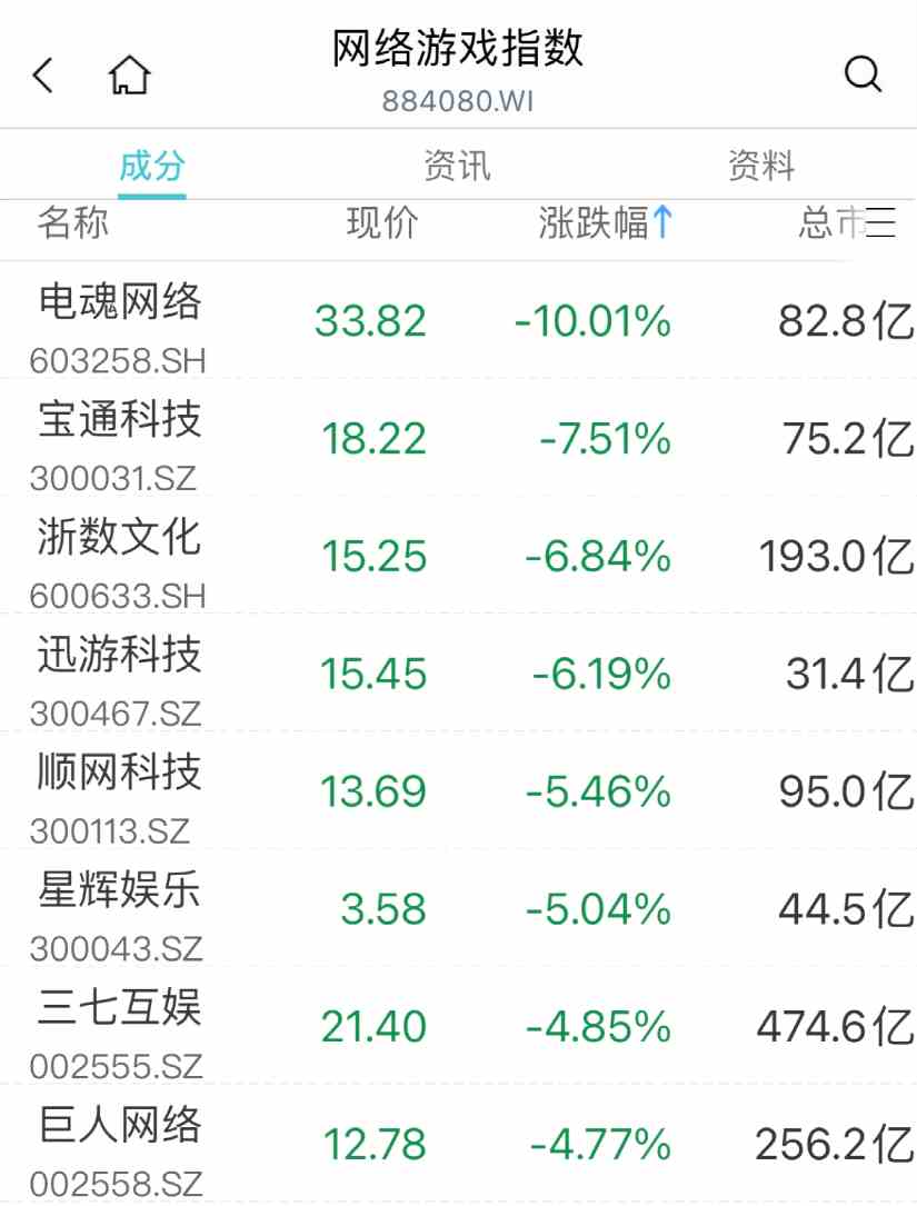 互聯(lián)網(wǎng)游戲板塊大幅走低,電魂網(wǎng)絡(603258)跌停,寶通科技(300031)、浙數(shù)文化(600633)等集體跌超5%。