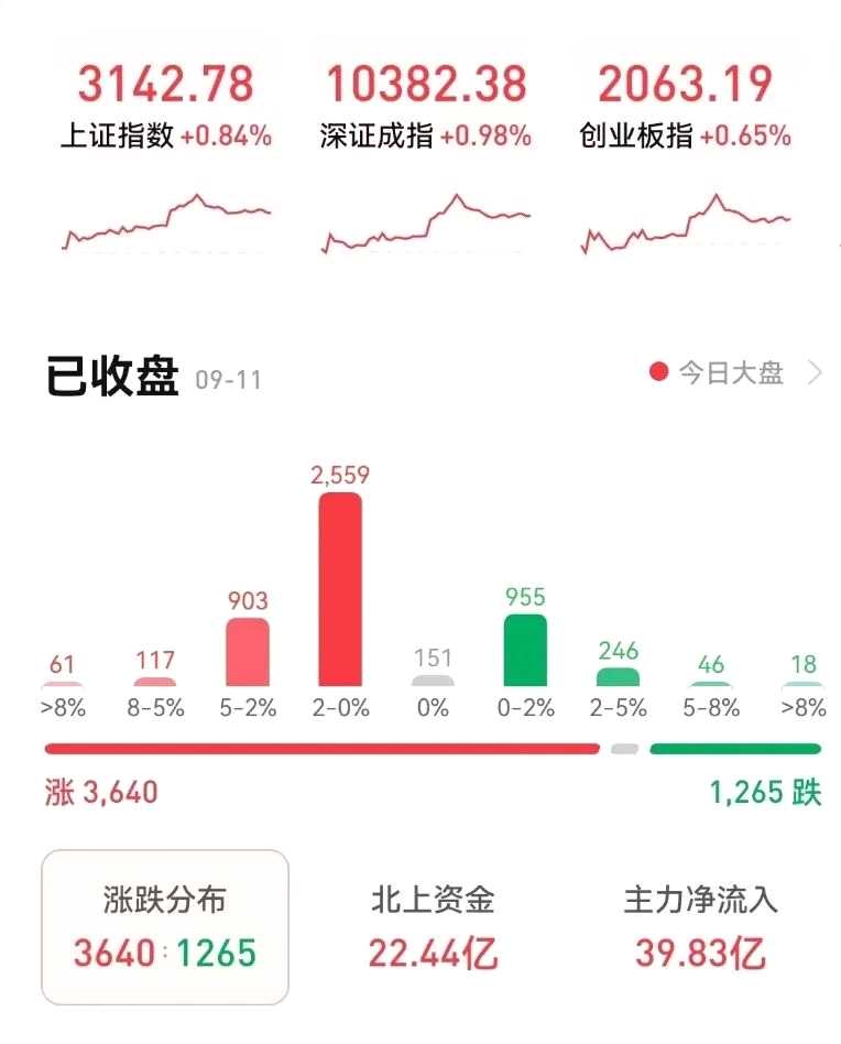 截至收盤,上證指數(shù)報(bào)3142.78點(diǎn),漲0.84%;深證成指報(bào)10382.38點(diǎn),漲0.98%;創(chuàng)業(yè)板指報(bào)2063.19點(diǎn),漲0.65%。滬深兩市合計(jì)成交8410億元,超3600股飄紅。