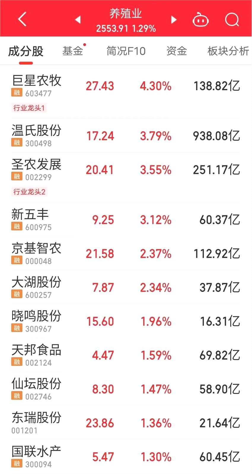 9月11日,養(yǎng)殖業(yè)板塊較上一交易日上漲0.89%,曉鳴股份(300967)領(lǐng)漲。9月12日,養(yǎng)殖業(yè)板塊繼續(xù)上漲,巨星農(nóng)牧(603477)、溫氏股份(300498)、圣農(nóng)發(fā)展(002299)、新五豐(600975)等領(lǐng)漲。