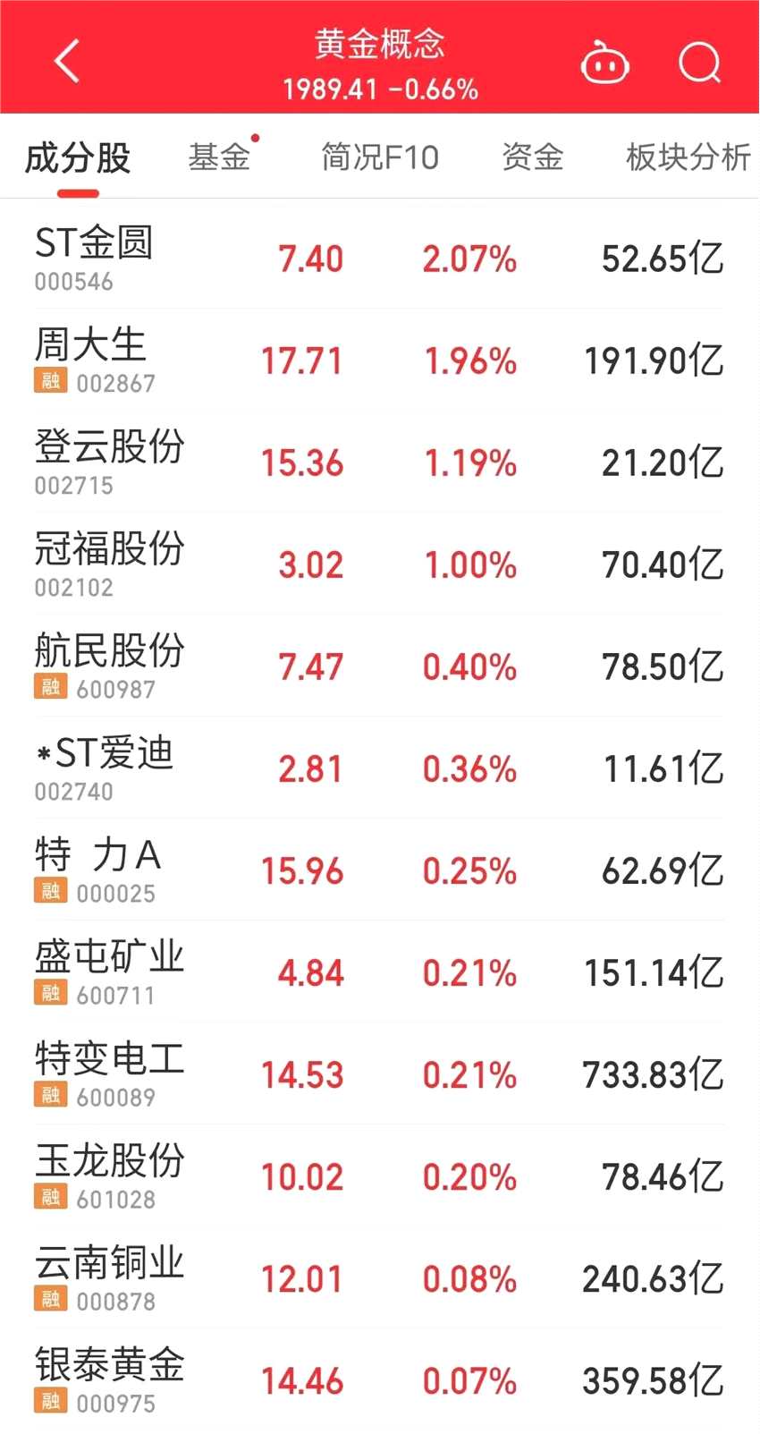 今日,黃金概念板塊下跌0.64%,但多只概念股上漲。其中,ST金圓(000546)、周大生(002867)、登云股份(002715)、冠幅股份、萃華珠寶(002731)、玉龍股份(601028)等漲幅居前。