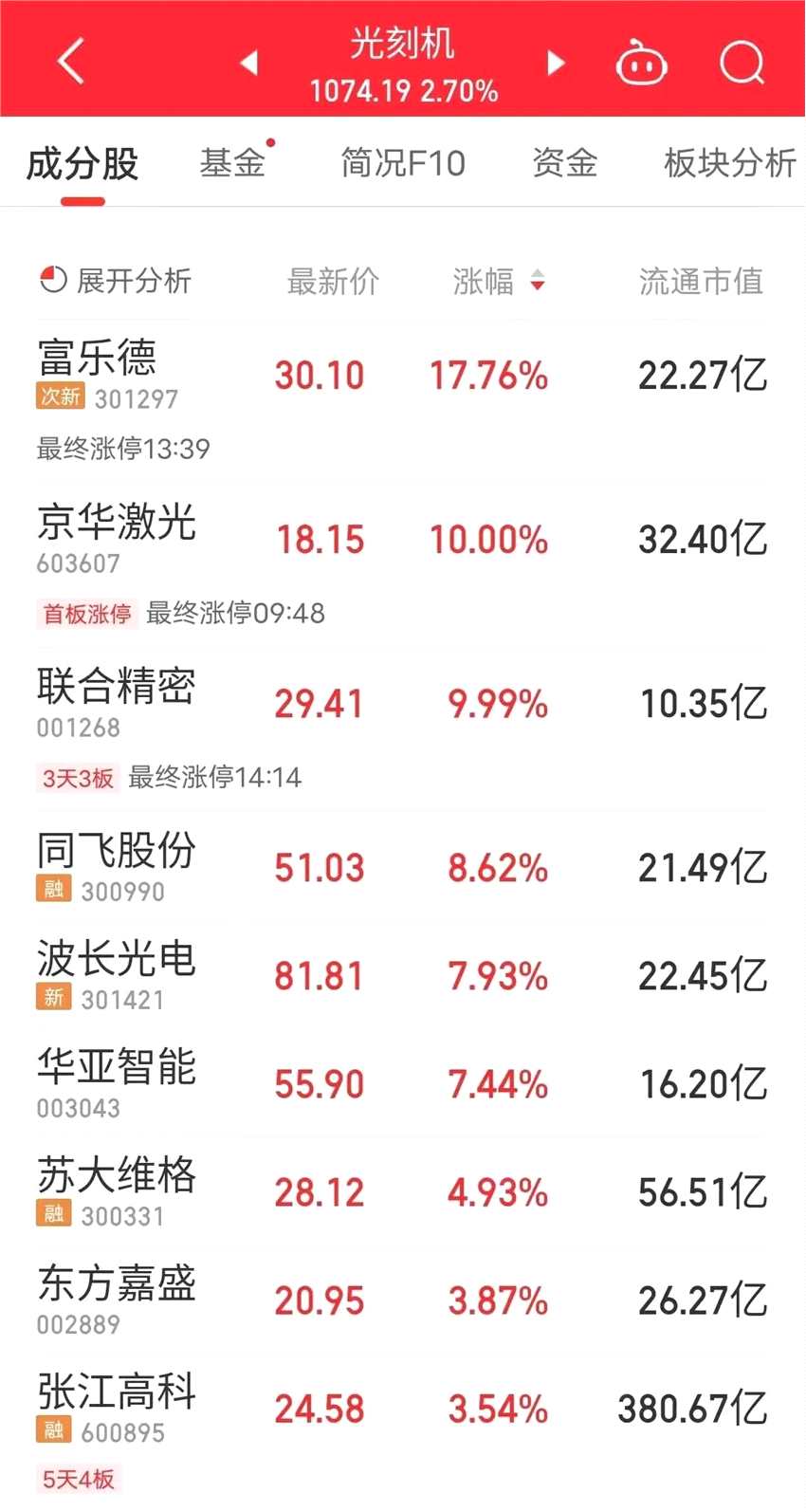 9月12日早盤,光刻機(jī)概念股探底回升,京華激光(603607)漲停,張江高科(600895)漲超5%,同飛股份(300990)、富樂德(301297)、騰景科技、茂萊光學(xué)等跟漲。富樂德、聯(lián)合精密(001268)午盤漲停,其中聯(lián)合精密已三天三板。