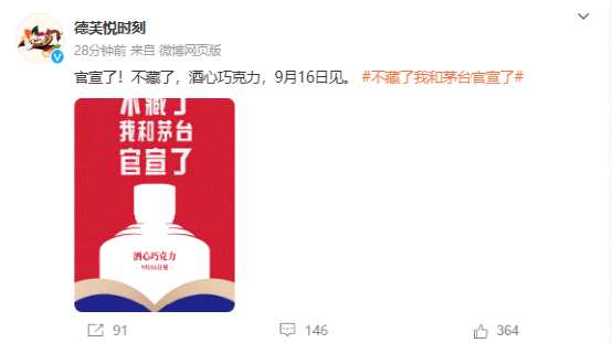 9月14日上午,貴州茅臺(600519)和德芙雙雙在微博官宣,雙方合作的酒心巧克力將于9月16日上市。