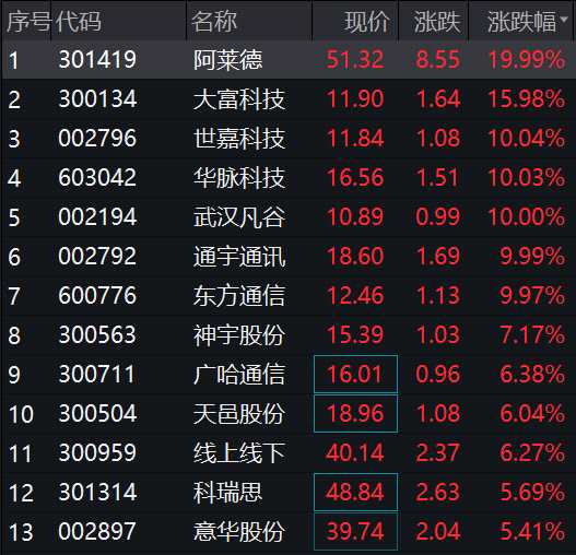 具體來看,阿萊德(301419)開盤迅速實現(xiàn)20CM漲停,世嘉科技(002796)、華脈科技(603042)、武漢凡谷(002194)、通宇通訊(002792)、東方通信(600776)等多個股封板。大富科技(300134)沖擊20CM漲停,神宇股份(300563)、廣哈通信(300711)、線上線下(300959)等多個股漲超5%。