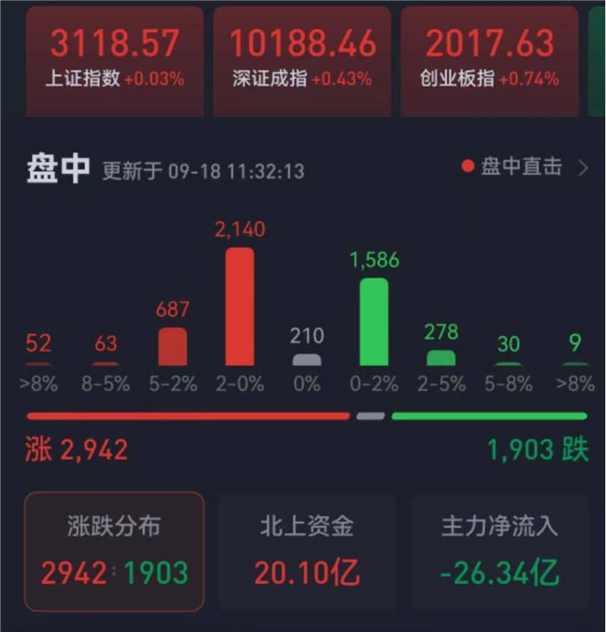 周一(9月18日),三大股指震蕩攀升,全線飄紅。截至上午收盤(pán),上證指數(shù)漲幅達(dá)0.03%,報(bào)3118.57點(diǎn);深證成指和創(chuàng)業(yè)板指漲幅分別為0.43%和0.74%;滬深兩市合計(jì)成交額4455.1億元,總體來(lái)看,兩市個(gè)股漲多跌少,上漲個(gè)股近3000只。漲停個(gè)股達(dá)46只,跌停個(gè)股達(dá)7只。