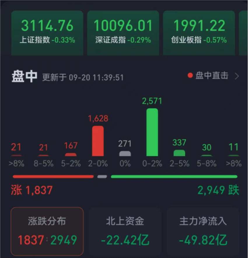 周三(9月20日),三大股指繼續(xù)震蕩整理。截至上午收盤,上證指數(shù)跌幅達0.33%,報3114.76點;深證成指和創(chuàng)業(yè)板指跌幅分別為0.29%和0.57%,創(chuàng)業(yè)板指失守2000點整數(shù)關(guān)口;滬深兩市合計成交額3469.8億元,總體來看,兩市個股跌多漲少,近3000只個股下跌。漲停個股達28只,跌停個股達5只。