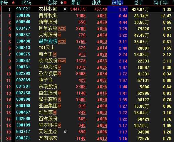 具體看,截至9月20日上午收盤,農(nóng)林牧漁板塊漲幅居首,達1.07%。其中,西部牧業(yè)(300106)、新賽股份(600540)等概念股漲幅均超4%。