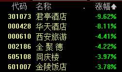 餐飲旅游板塊今日跌幅較大,其中長白山(603099)跌停,君亭酒店(301073)盤中一度逼近跌停,華天酒店(000428)、曲江文旅(600706)跌8%左右。