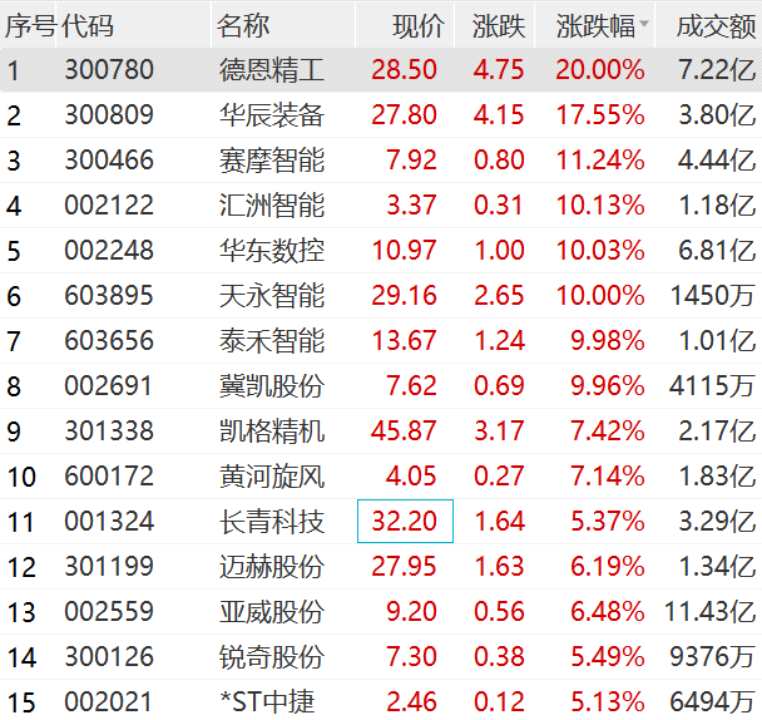 另外,上午機械設備板塊走高,多股大舉漲停。其中,工業(yè)母機概念走高,德恩精工(300780)實現20CM漲停,華辰裝備(300809)逼近漲停線;華東數控(002248)漲停,亞威股份(002559)早間觸及漲停板。