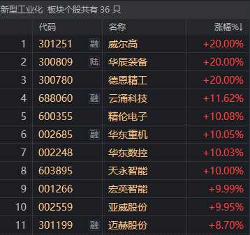 昨天“問(wèn)世”就大漲的新型工業(yè)化板塊,今天仍高舉高打,兩個(gè)交易日整體漲幅就超過(guò)了10%。