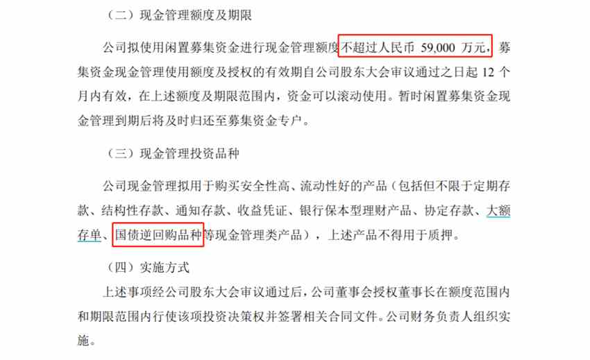 昨晚其公告稱(chēng),公司于9月22日召開(kāi)第一屆董事會(huì)第十六次會(huì)議、第一屆監(jiān)事會(huì)第十四次會(huì)議,審議通過(guò)了《關(guān)于使用部分閑置募集資金進(jìn)行現(xiàn)金管理的議案》,同意公司使用不超過(guò)人民幣5.9億元閑置募集資金進(jìn)行現(xiàn)金管理。投資安全性高、流動(dòng)性好的產(chǎn)品(包括但不限于定期存款、結(jié)構(gòu)性存款、通知存款、收益憑證、銀行保本型理財(cái)產(chǎn)品、協(xié)定存款、大額存單、國(guó)債逆回購(gòu)品種等現(xiàn)金管理類(lèi)產(chǎn)品)。