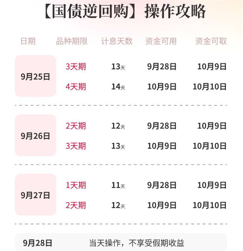 而明天,即本周三(9月27日)也是操作國(guó)債逆回購(gòu)的最佳時(shí)點(diǎn)之一。這天,只需投資1天期逆回購(gòu)就可以賺到11天的利息,且資金在10月9日開(kāi)盤(pán)前即可取。
