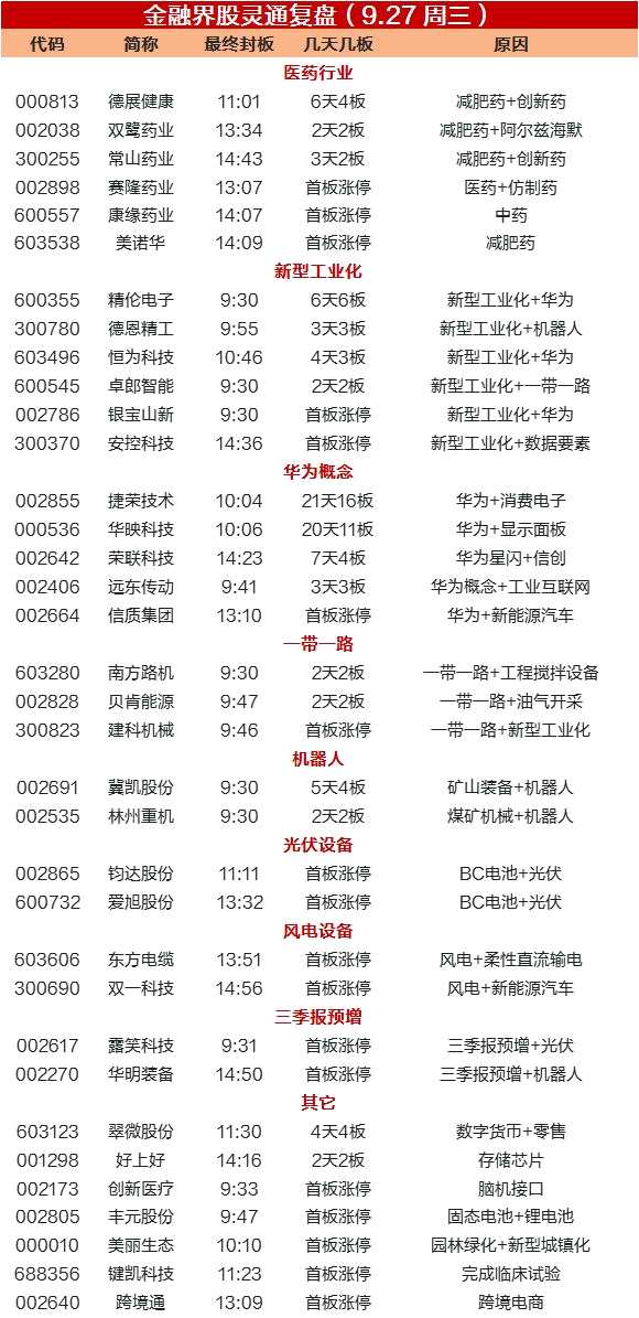 9月27日漲停復(fù)盤:醫(yī)藥股強(qiáng)勢(shì)爆發(fā),華為概念、新型工業(yè)化表現(xiàn)搶眼,賽道股、業(yè)績(jī)預(yù)增股受資金青睞