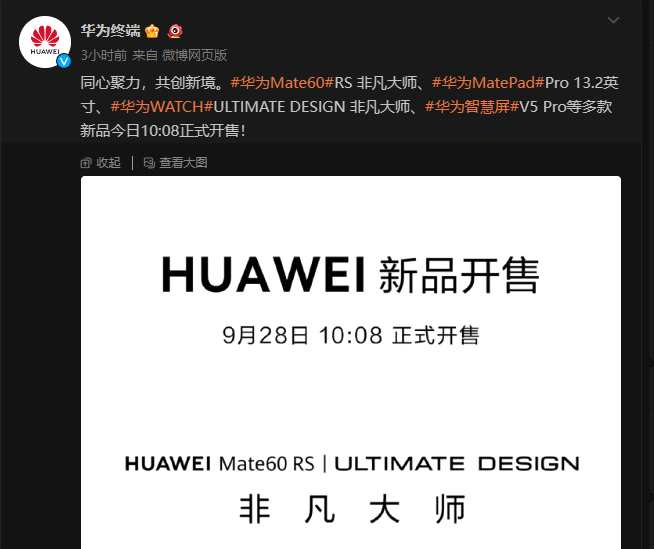 消息面上,華為Mate60RS非凡大師、華為MatePadPro 13.2英寸、華為WATCHULTIMATE DESIGN非凡大師、華為智慧屏V5 Pro等多款新品今日10:08正式開售。官網(wǎng)顯示,剛開售不久Mate60RS就已處于缺貨狀態(tài)。