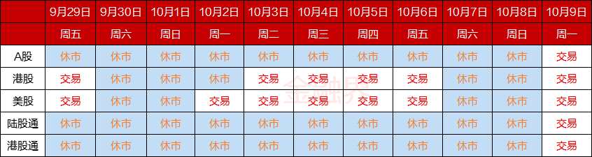 中秋節(jié)疊加十一假期將至,A股進(jìn)入長達(dá)10天的休市期。本輪“雙節(jié)”休市將從9月29日(周五)開始,直到10月9日(周一)開市,期間陸股通及港股通也將同步關(guān)閉。港股方面,將從9月30日閉市,10月3日恢復(fù)正常交易。美股方面則正常交易,無特殊安排。這意味著A股將比港股少5個(gè)交易日,比美股少6個(gè)交易日。
