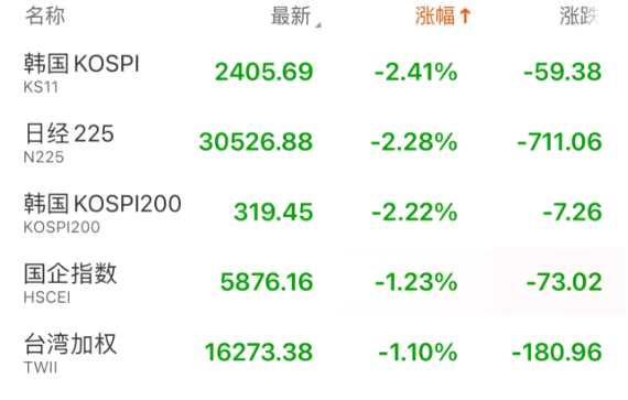 周三亞太股指集體大跌,日經(jīng)225指數(shù)跌2%,韓國(guó)KOSPI指數(shù)跌2.41%,澳大利亞S&P/ASX200指數(shù)跌0.77%,臺(tái)灣加權(quán)指數(shù)跌1.1%。