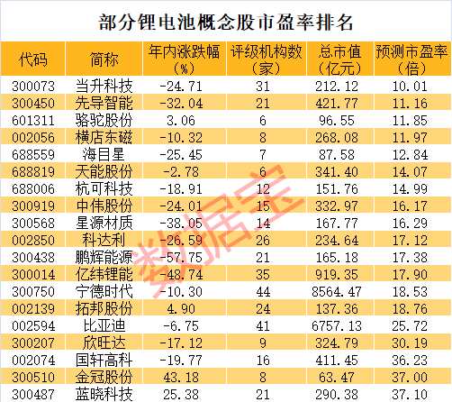 機(jī)構(gòu)關(guān)注度較高且上半年凈利逆市上漲的鋰電池概念股,有望成為反彈龍頭。數(shù)據(jù)寶統(tǒng)計(jì),5家以上機(jī)構(gòu)評(píng)級(jí)個(gè)股中,有19只個(gè)股上半年凈利同比增長(zhǎng),金冠股份(300510)、國(guó)軒高科(002074)、比亞迪(002594)、寧德時(shí)代等個(gè)股上半年凈利同比增速均超100%。較低的估值也有望支撐公司股價(jià)反彈。當(dāng)升科技(300073)、先導(dǎo)智能(300450)、駱駝股份(601311)等14股機(jī)構(gòu)一致預(yù)測(cè)今年市盈率低于20倍。