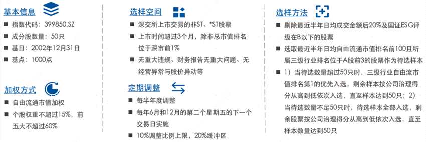 在編制方法上,有別于傳統(tǒng)寬基指數(shù)主要按照總市值選股,深證50在設(shè)置流動(dòng)性篩選、ESG負(fù)面剔除后,按照公司自由流通市值排名、在A股市場(chǎng)中行業(yè)地位、公司治理得分等指標(biāo),選取50只深市A股作為樣本,主要特點(diǎn)體現(xiàn)出“行業(yè)均衡”與“可持續(xù)性”。